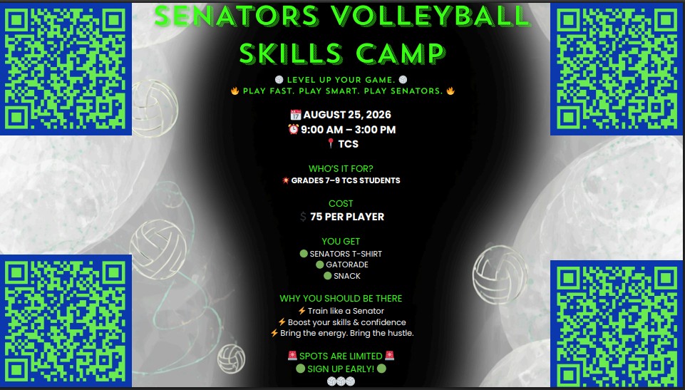 Our annual Volleyball Skills Camp is designed for current and future TCS students in Grades 7–9. Whether you’re hoping to try out for a junior high team, build confidence in your game, improve your fitness, or meet new people, this one-day camp is a great chance to show what it means to be a Senator.